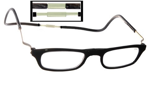 These NEW readers are for people with both regular and REALLY BIG HEADS, incorporating features from other designs with an important new innovation, the EXPANDABLE HEADBAND. CliC Original and Classic are adjustable enough to fit most men and women comfortably. But VERY RARELY we have had people whose head just did not fit the shape of the regular CliC headband. These glasses are for those people. OK, these new CliC XXL will still fit almost everybody comfortably, even those with regular size heads. But now they adjust not just longer but also just a little bit wider for those who need some extra room. They use the same contemporary rectangular lenses as the original readers. They use the slightly wider flared metal arms of the Classic readers. The length is adjustable, of course, like all CliCs. Then, in the very back, in the center of the head band, there is a NEW expandable section that allows you to adjust the width as well. They are available in black, and the metal arms at the temples are gold. They measure 140mm at the lenses, then flare to an overall width of 150 mm at the temple. The length is adjustable from 210 to 230 mm. The head and neck band can be expanded wider by 20 mm in the back. When you're not using them, they simply hang around your neck until you need them. You won't lose them, or sit on them. CliC readers have a unique and patented neodymium magnet front connection system, connected to an adjustable form fitting head and neck band, rather than to a cumbersome chain tangle. To put on the CliC readers, simply place the band around the head, and the magnetic front connection will guide the lenses closed to rest on the nose. To remove, simply separate the eye pieces and allow the CliC readers to hang around the neck. Finally, reading glasses that are hard to misplace.